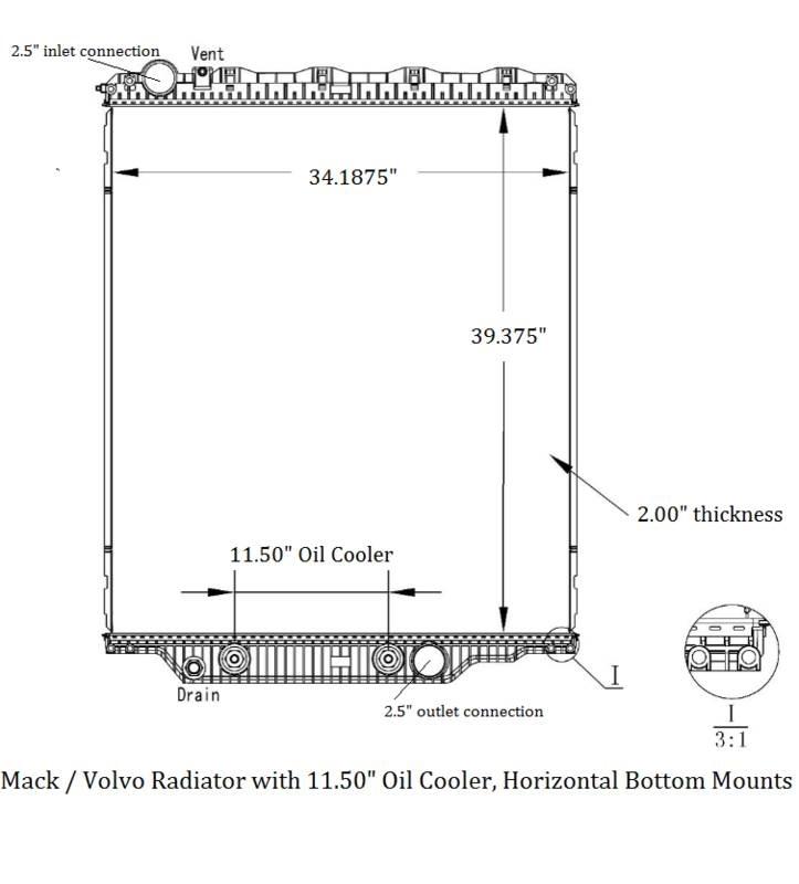 NTO CHU Mack Volvo Radiator w/ 11.5 TOC (with horizontal bottom mounts)